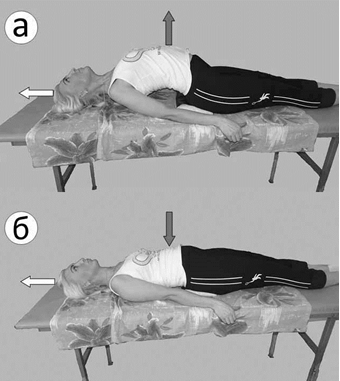Обозначения: а – прогибание позвоночника, б – прижимание спины к поверхности
